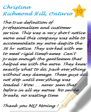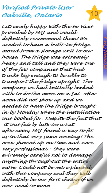 MSJ Moving West is pleased to share our reviews with the online world. After all, establishing our brand online is critical in today’s fast paced, digital economy. While you will find many positive reviews online, we have chosen HomeStars as our primary review source. Our reasoning behind this is simple. HomeStars takes a number of additional measures to ensure reviews are accurate and truthful which is much appreciated. MSJ Moving West also responds to reviews within a timely fashion as to ensure the best possible customer experience. If you have used our service and have any feedback, don’t hesitate to share your experience on HomeStars.